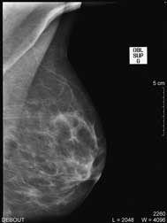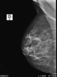 Debout, le sein légèrement comprimé, deux clichés sont réalisés de face et en oblique sur chaque coté ; d’autres clichés localisés pour mieux analyser une zone peuvent aussi être effectués. |