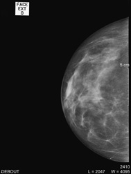 Debout, le sein légèrement comprimé, deux clichés sont réalisés de face et en oblique sur chaque coté ; d’autres clichés localisés pour mieux analyser une zone peuvent aussi être effectués. |